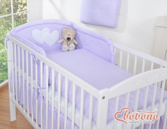 3.Ochraniacz uniwersalny zaokrąglony 35x188cm.Wysoki i sprężystyochraniacz doskonale amortyzuje i ochroni Twoje Maleństwo przed twardymi szczebelkami łóżeczka. Specjalnie skonstruowany i z dodatkowymi przeszyciami, tak by idealnie pasował zarówno na łóżeczko 120x60 cm, jak i na większe łóżeczko-tapczanik 140x70 cm, będzie więc wam dłużej służył. Zagłówek ozdobiony dużymi aplikacjami serduszek, pięknie obszytymi atłasową lamówką . Ochraniacz wypełniony jest grubą warstwą sprężystej antyalergicznej włókniny silikonowej, dzięki czemu ładnie układa się na łóżeczku. Włóknina posiada certyfikat Ökotex. Ochraniacz na łóżeczko wykonany jest z najwyższej jakości bawełny, która nie spiera się, "nie mechaci" i nie traci swoich właściwości nawet po wielu praniach. Bawełniane mocne troczki umożliwiają łatwe i solidne przymocowanie ochraniacza do łóżeczka dziecięcego.