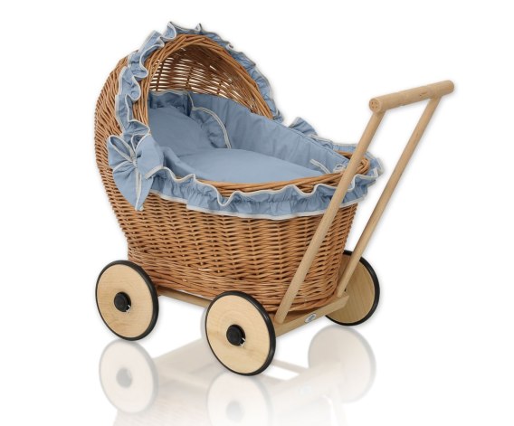 Wiklinowy wózek dla lalek pchacz z pościelką brudny niebieski i miękką wyściółką CHIARA - naturalny